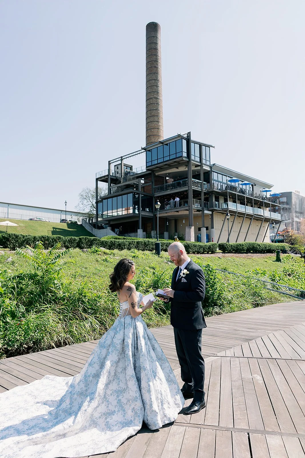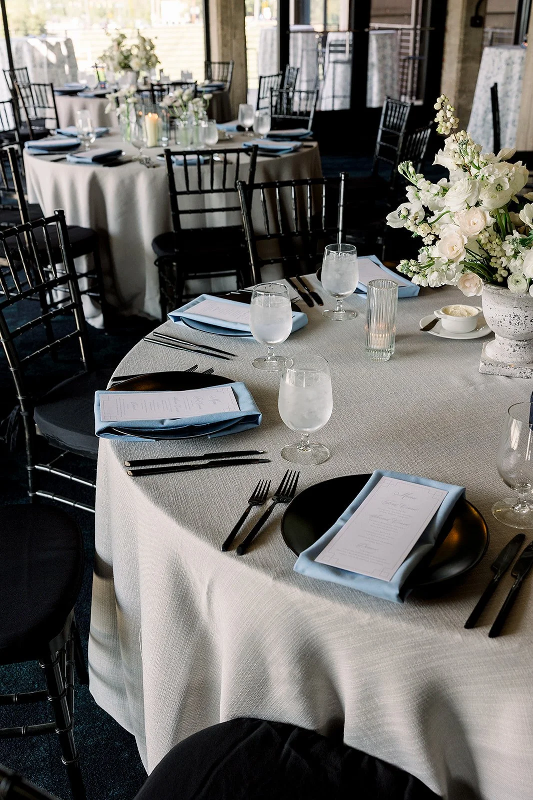 The design palette was a striking combination of classic coastal modern industrial elements, leaning into a sophisticated color story of blue, black, and crisp white. This refined color scheme beautifully complemented the industrial elements of the indoor event space, creating a look that was both contemporary and timeless. Lianne’s bridal style further elevated the vision; she wore an exquisite gown featuring a white base adorned with intricate silver and blue detailing. It was a brilliant, fashion-forward choice that felt perfectly suited to the shimmering river backdrop.