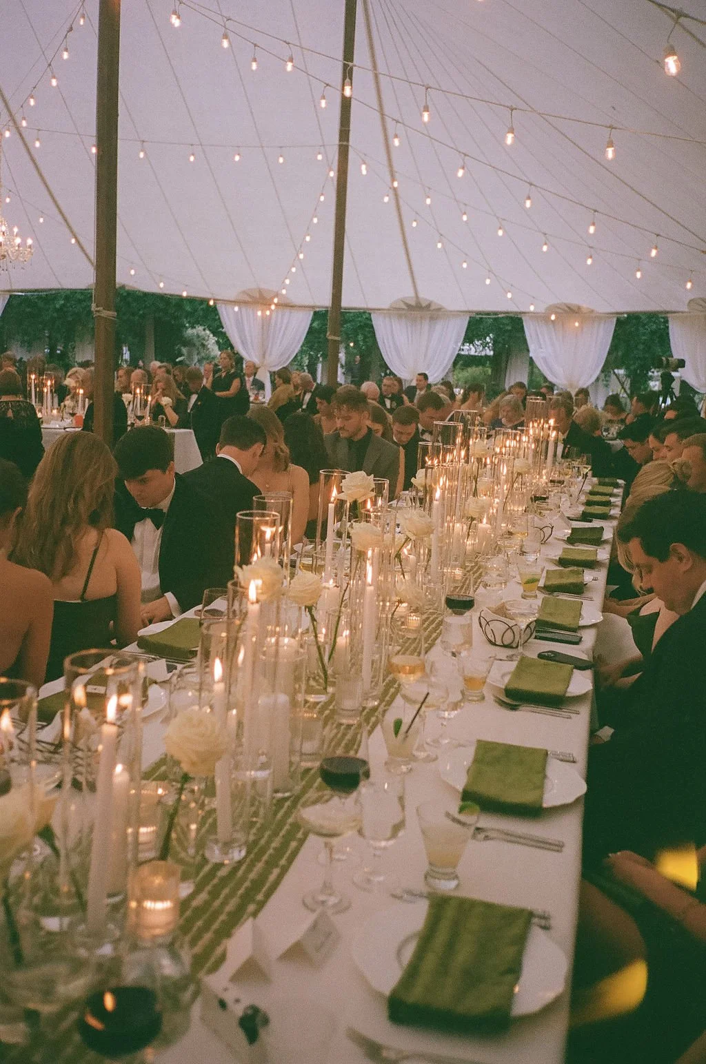 The design palette was a sophisticated blend of classic Virginia style and modern, editorial details. We leaned into a Martini Theme for the entire weekend, which served as a playful yet polished thread throughout the weekend. This motif inspired custom graphics, which appeared on many design elements, including the invitations, welcome bag tags, and cocktail napkins. To bring an unexpected, fashion-forward element to the cocktail hour, we utilized a rich olive green palette and tied delicate bows around the stems of the martini glasses—a small detail that felt both whimsical and high-end.
